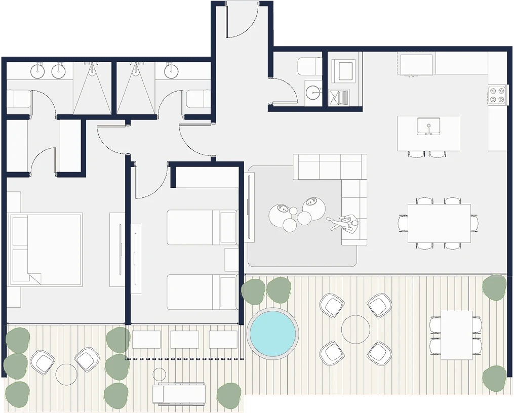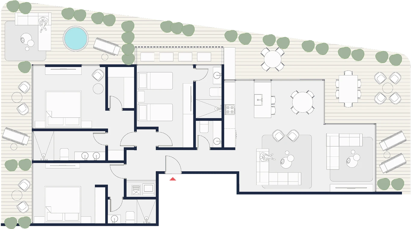 Residenciales distribuidos en: villas, apartamentos, residencias con piscina privada y penthouses exclusivos. Con espacios desde 100 m2 hasta 478 m2, adaptándose a diferentes estilos de vida y necesidades